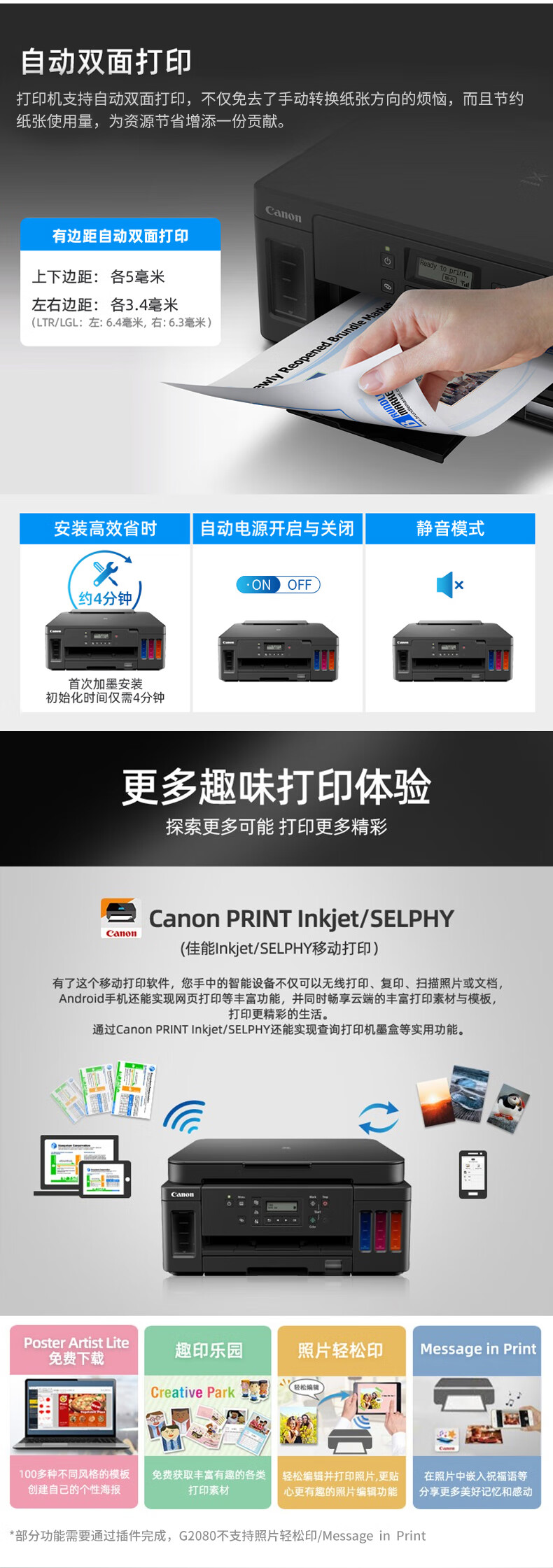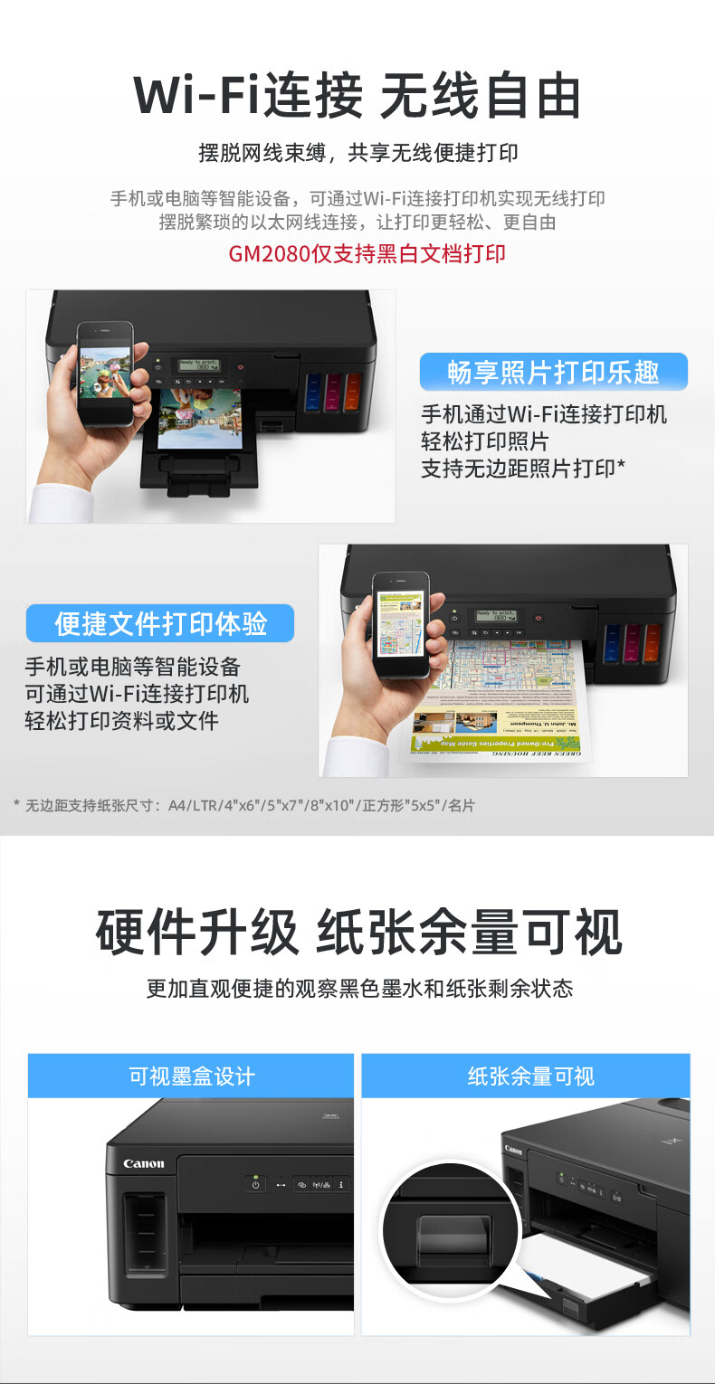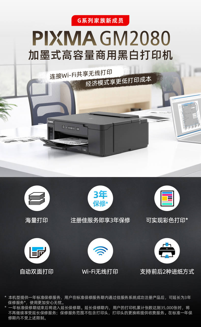 佳能(Canon)黑白噴墨打印機(jī)商用辦公文件無(wú)線墨家用打印機(jī) GM2080單 黑色單打印(雙面/無(wú)線/雙向進(jìn)紙) 自營(yíng)