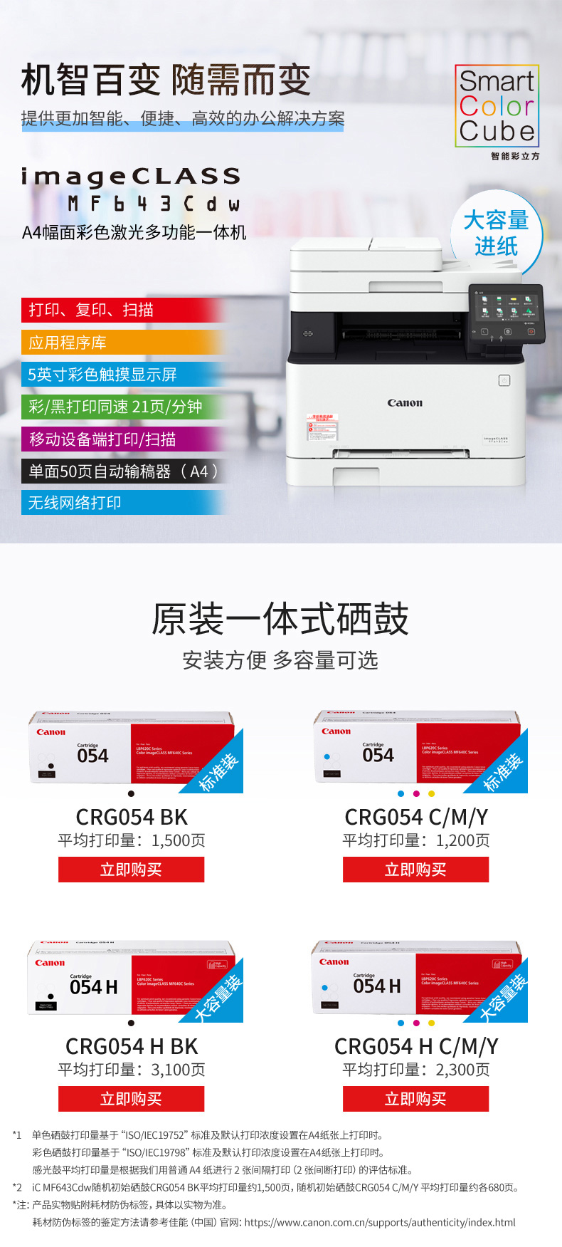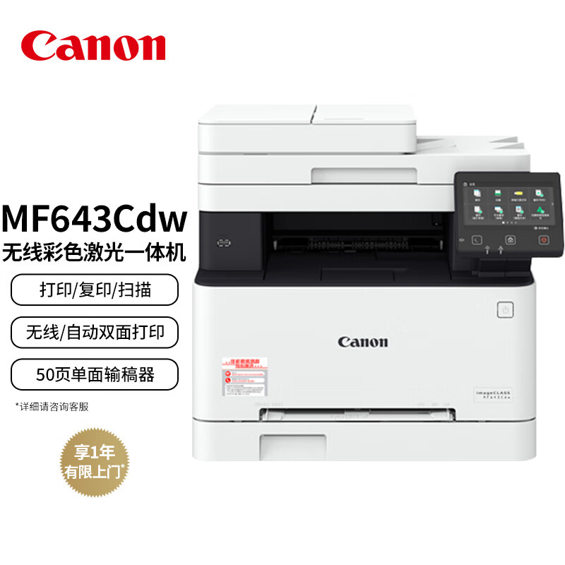 佳能(Canon)iC MF643Cdw A4幅面無線彩色激光多功能一體機(打印/復印/掃描/自動雙面/自動輸稿器 商用) 自營