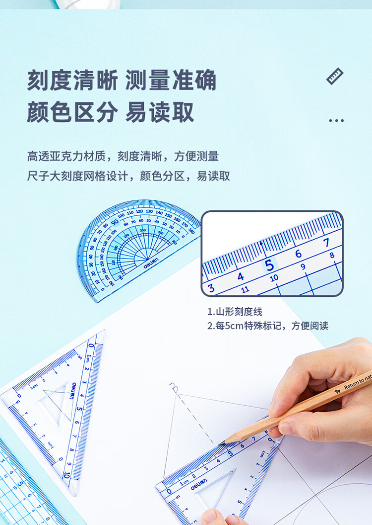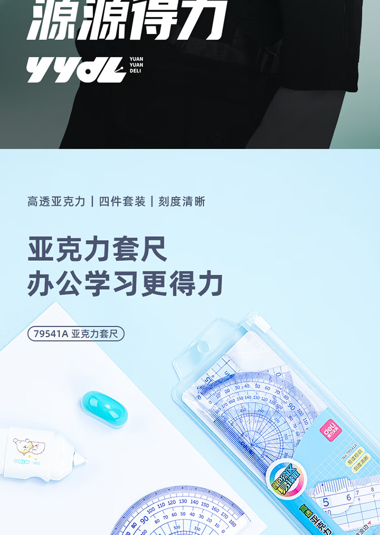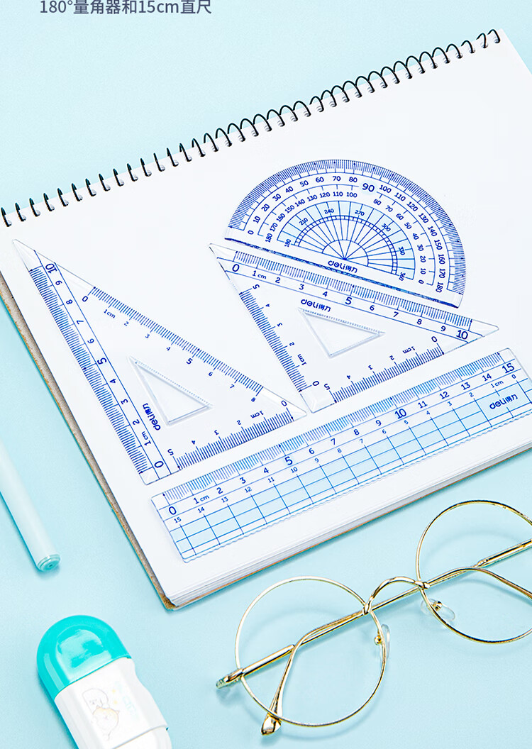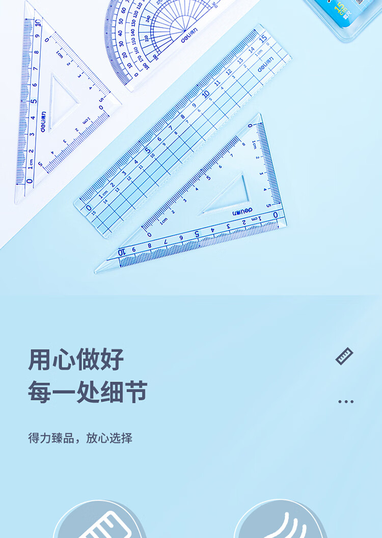 得力(deli)源源得力 王源款學(xué)生基礎(chǔ)款直尺三角尺量角器繪圖組合套尺4件套帶方格 藍(lán) 79541A 自營