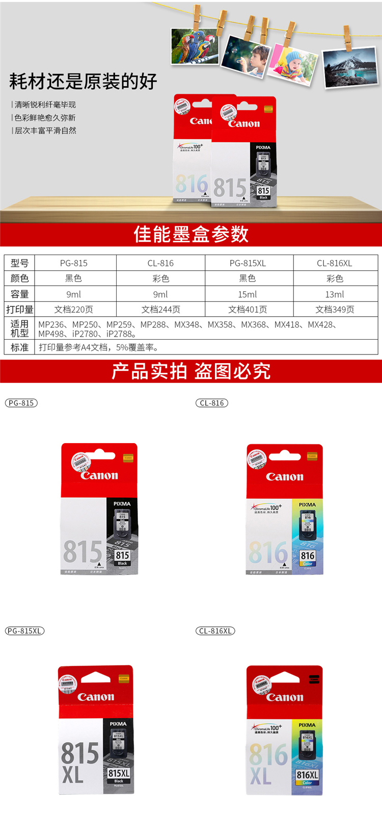 佳能(Canon)PG-815XL+CL-816XL原裝墨盒(黑+彩)適用MP259 MP288 MX348 MX368 高容組合裝 自營